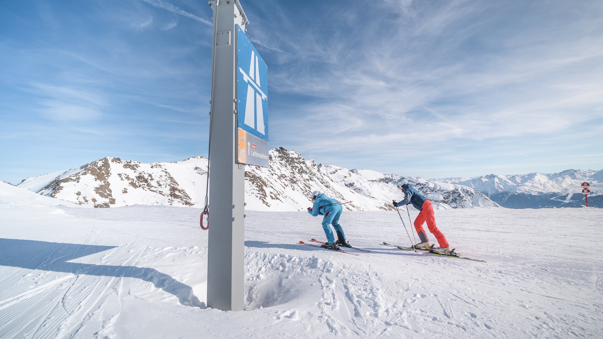 Der Startpunkt liegt an der Alblittkopfbahn auf 2.640 Metern. Gleich zu Beginn heißt es: Schwung holen. Ein kurzer Ziehweg führt zur eigentlichen Abfahrt – hier wird angeschoben und mit dem Schlittschuhschritt noch einmal ordentlich Tempo aufgenommen. Danach öffnet sich das Gelände und der Blick fällt in das beeindruckende Malfon.