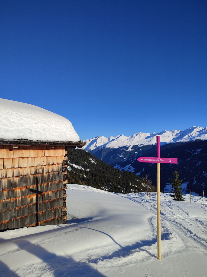 Die Schneeschuhrundwanderung startet an der Bergstation der Diasbahn. Die beschilderte Schneeschuhroute führt zunächst entlang des Fahrweges zu einem ruhig gelegenen Holzstadel, der sich perfekt für eine Pause anbietet. Hier kannst du die herrliche Aussicht auf die winterliche Bergwelt von Kappl genießen. Der Rückweg bringt dich zurück zur Bergstation der Diasbahn, wo das Sunny Mountain Restaurant zum Verweilen einlädt.